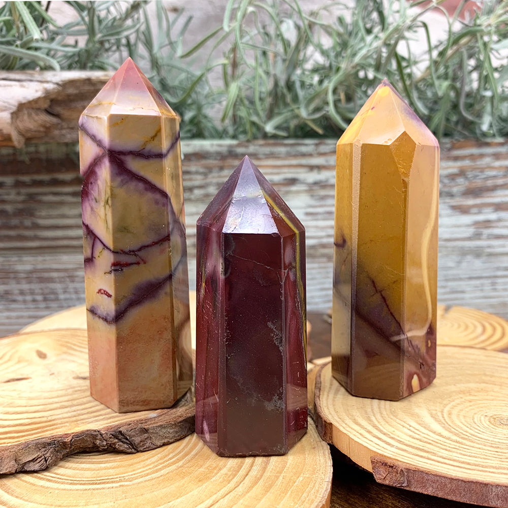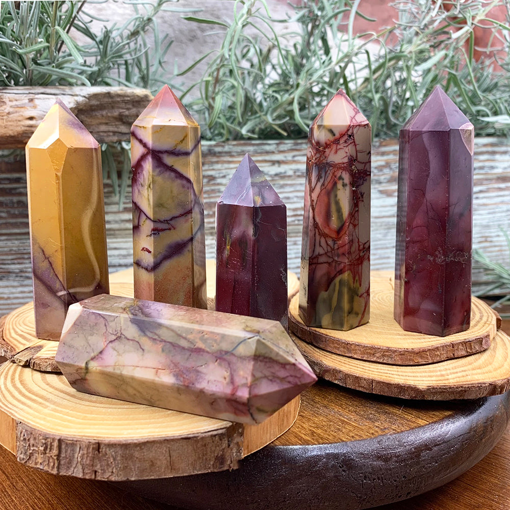 Mookaite, renowned for its kaleidoscope of colors, presents a mesmerizing palette resembling a painter's vibrant canvas. These points showcase a spectrum that ranges from warm ochres to earthy reds, including mustard yellows and purples. Each point, like a piece of nature's artistry, holds a unique composition of swirling tones, reminiscent of the Australian landscape where it's found. This gemstone is believed to embody the energy of vitality and encourages a connection to the earth, promoting a sense of adventure and the courage to embrace new experiences. The multitude of colors within Mookaite points symbolize the richness of life's possibilities and the beauty found in embracing diversity.