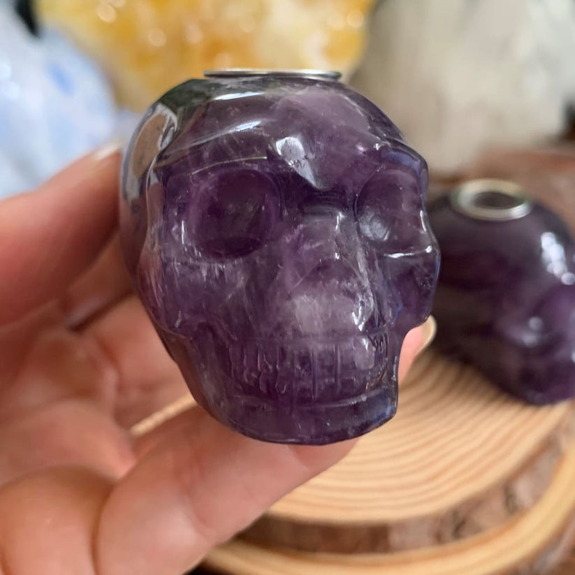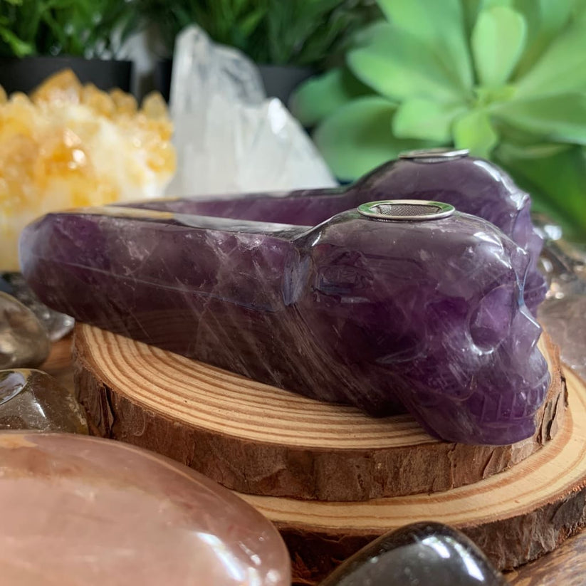 The Amethyst Crystal Skull Pipe is designed for herbal blends, offering a smooth and enjoyable experience while connecting you to the soothing energy of Amethyst.